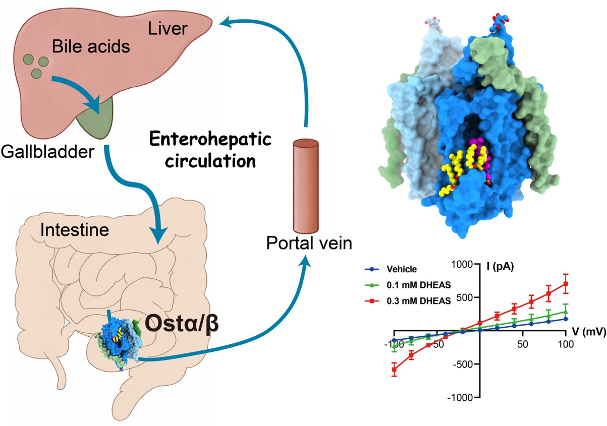 The researchers also identified a hydrophilic tunnel extending from the binding groove toward the extracellular side of the transporter. Molecular dynamics simulations and electrophysiological recordings showed that substrates move through this pathway in a voltage-dependent manner. Notably, the team leveraged the intrinsic charge of cholic acid to directly convert bile acid flux into an electrical signal: by recording transporter-associated currents, they provided a direct, quantitative readout of bile acid transport. This represents a conceptual advance for the field—using a charged bile acid as the transported species to measure bile acid transport by current recording—linking structure to transport in real time and with polarity control.