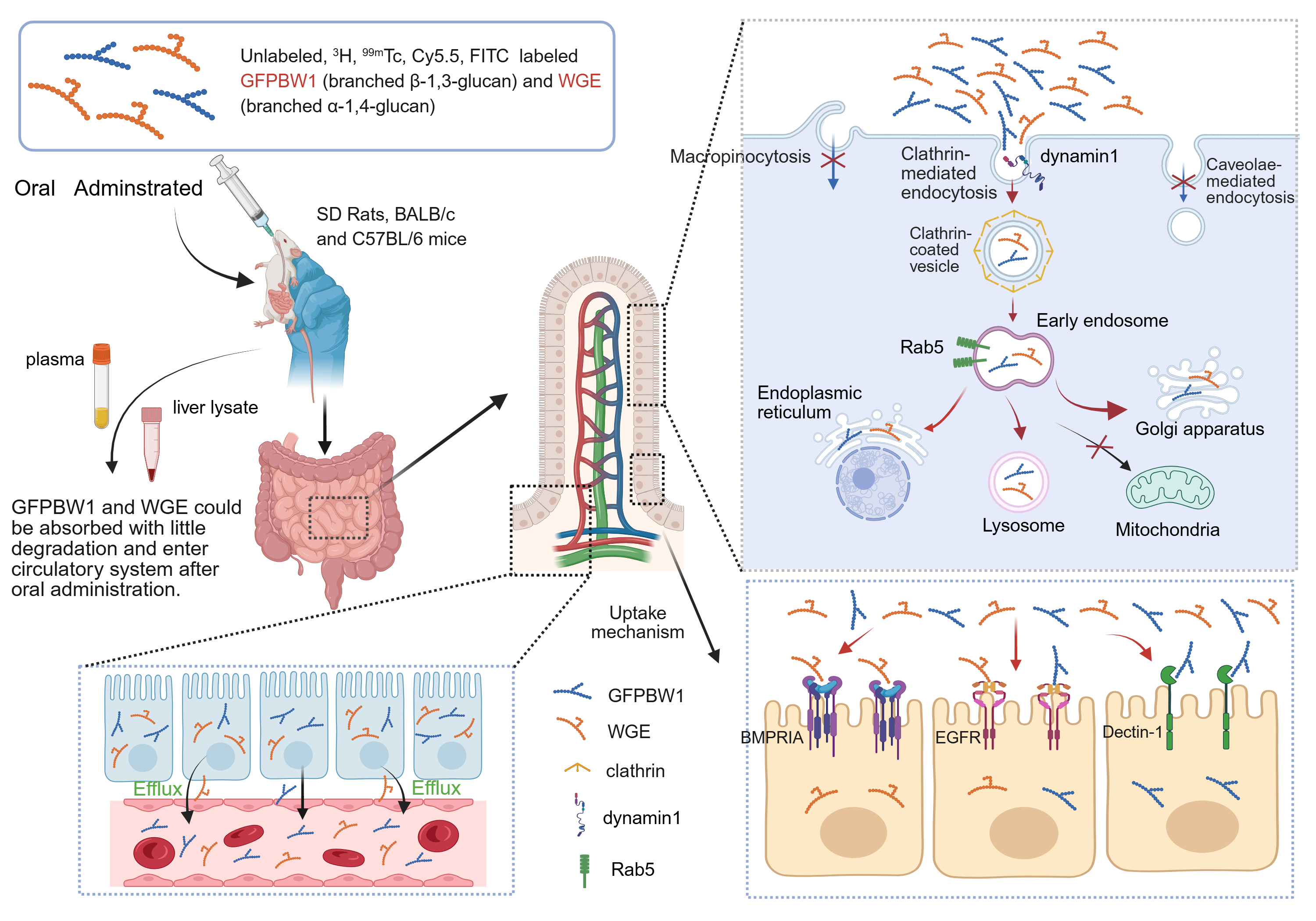 Two model polysaccharides, branched β-1,3-linked glucan GFPBW1 derived from Grifola frondosa. and branched α-1,4-linked glucan WGE derived from Gastrodia elata Bl., respectively representing the major structure from fungi and medical plants, were employed to do further exploration. Importantly, the team combined three independent strategies: unlabeled (rat), isotope labeled (⁹⁹ᵐTc and ³H), and fluorescent labeled (Cy5.5 and FITC) to track the polysaccharides, the results showed that both polysaccharides could enter the bloodstream as original macromolecules with little degradation after oral administration in rats and mice. And the polysaccharides were distributed mainly to the liver, kidney, and gallbladder.